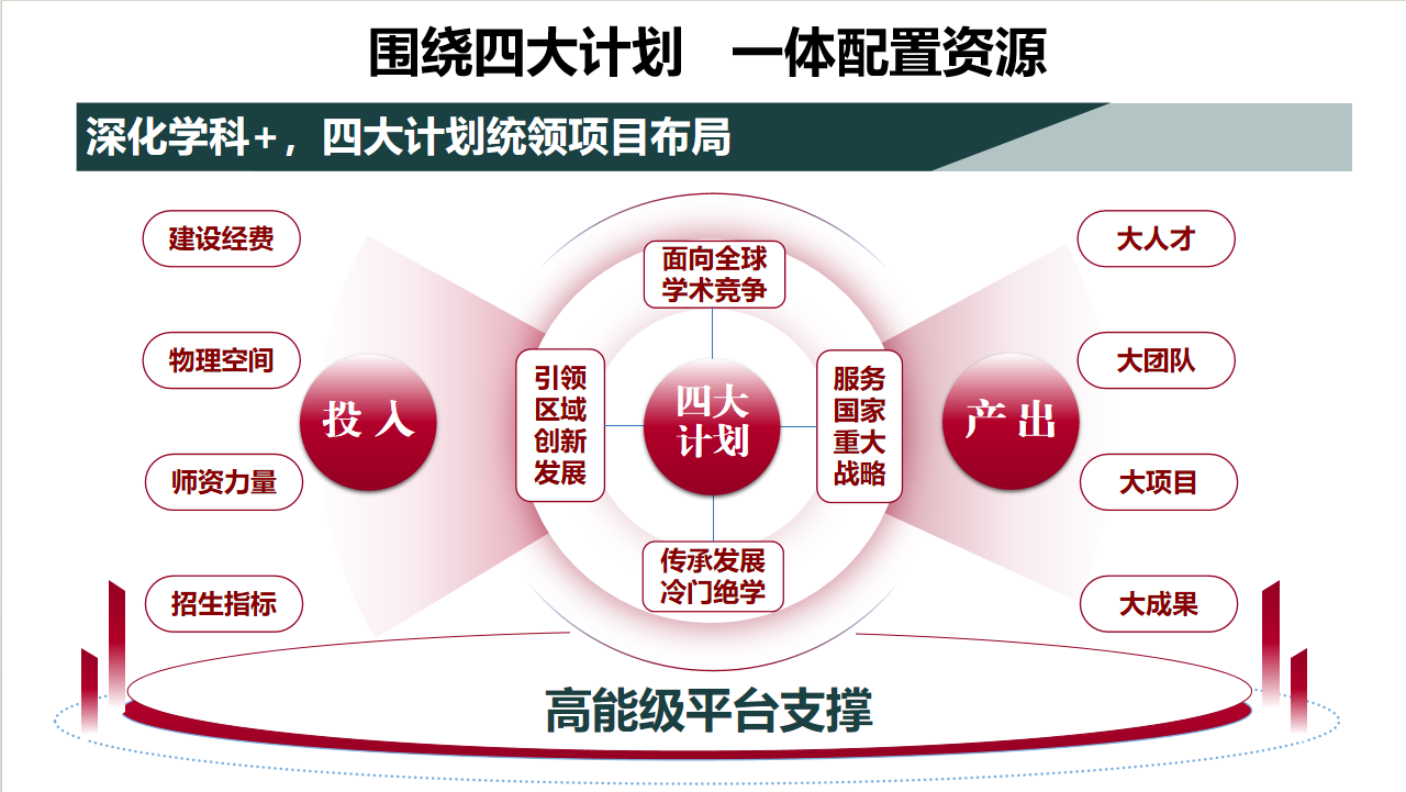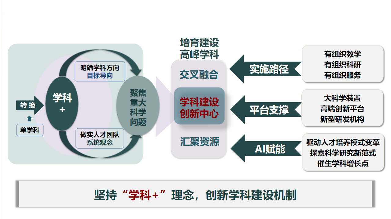 一是实施“三大计划”。通过优势学科提升计划打造高峰、基础学科振兴计划夯实创新根基、新兴交叉学科培养计划培育增长,围绕9个优势学科成立学科建设创新中心,以“学科+”理念汇聚主干学科与支撑学科优势资源,形成一流建设学科牵引,优势学科和特色学科助推,传统学科、新兴学科、交叉学科协同并进的发展布局。