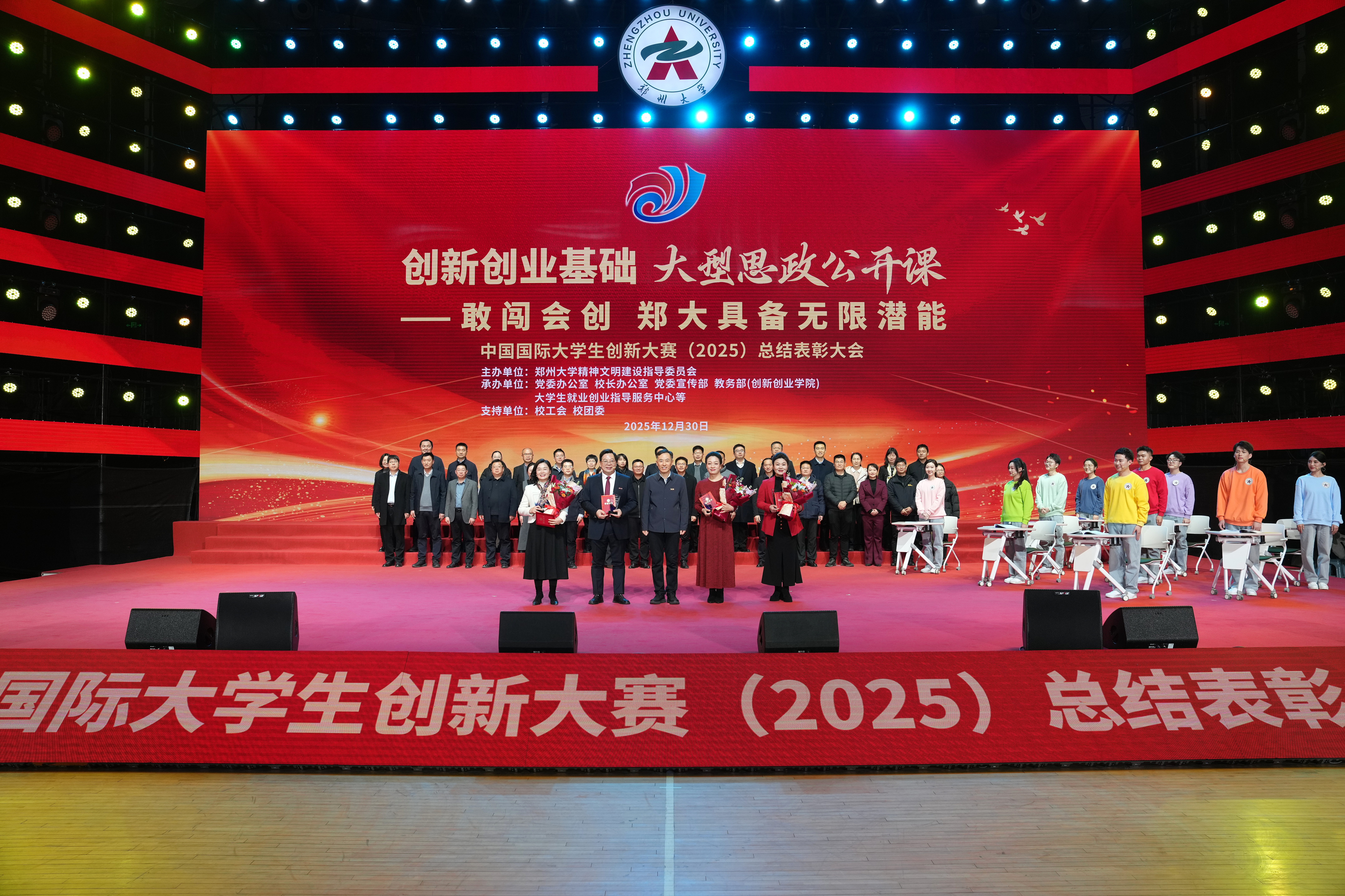 为深入落实立德树人根本任务,全面总结国创赛育人成果与办赛经验,表彰先进典型、凝聚奋进力量,并对2026年大赛进行动员部署,2025年12月30日晚,中国国际大学生创新大赛(2025)总结表彰大会暨“敢闯会创——郑大具备无限潜能”大型思政公开课在郑州大学主校区中心体育馆举行。全体在校校领导,省教育厅、郑州市教育局有关部门负责同志出席,大赛各专项组成员、金奖项目师生代表、志愿者及师生代表约1000人现场参加,活动同步线上直播,打造了一堂气势恢宏、形式生动的思政“金课”。