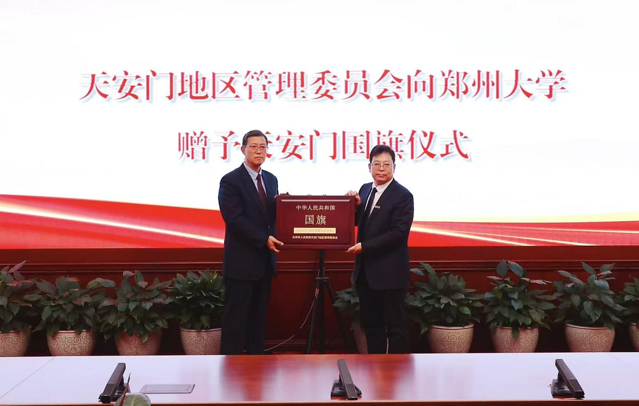 10月31日,北京市人民政府天安门地区管理委员会赠予天安门国旗仪式在北京举行。双方共同签署《国旗赠予协议》。获赠的国旗长5米、高3.3米,编号为2018-0091号,曾于2018年6月18日在天安门广场升起,该日期正是学校办学90周年纪念日,也是被确定为郑州大学校庆日和校友返校日的纪念日,这对学校而言,承载着无可替代的纪念意义与深厚情感。学校把这面承载特殊意义的国旗郑重珍藏于校史馆,使其成为传承红色基因的永恒载体和象征。学校将在国庆节、校庆日、开学典礼等重要时间节点取出国旗,举行庄严的仪式,引导全体师生将爱国之情融入血脉、强国之志铸入灵魂、报国之行化为自觉,为新时代中原更加出彩的宏伟篇章贡献热忱与力量。