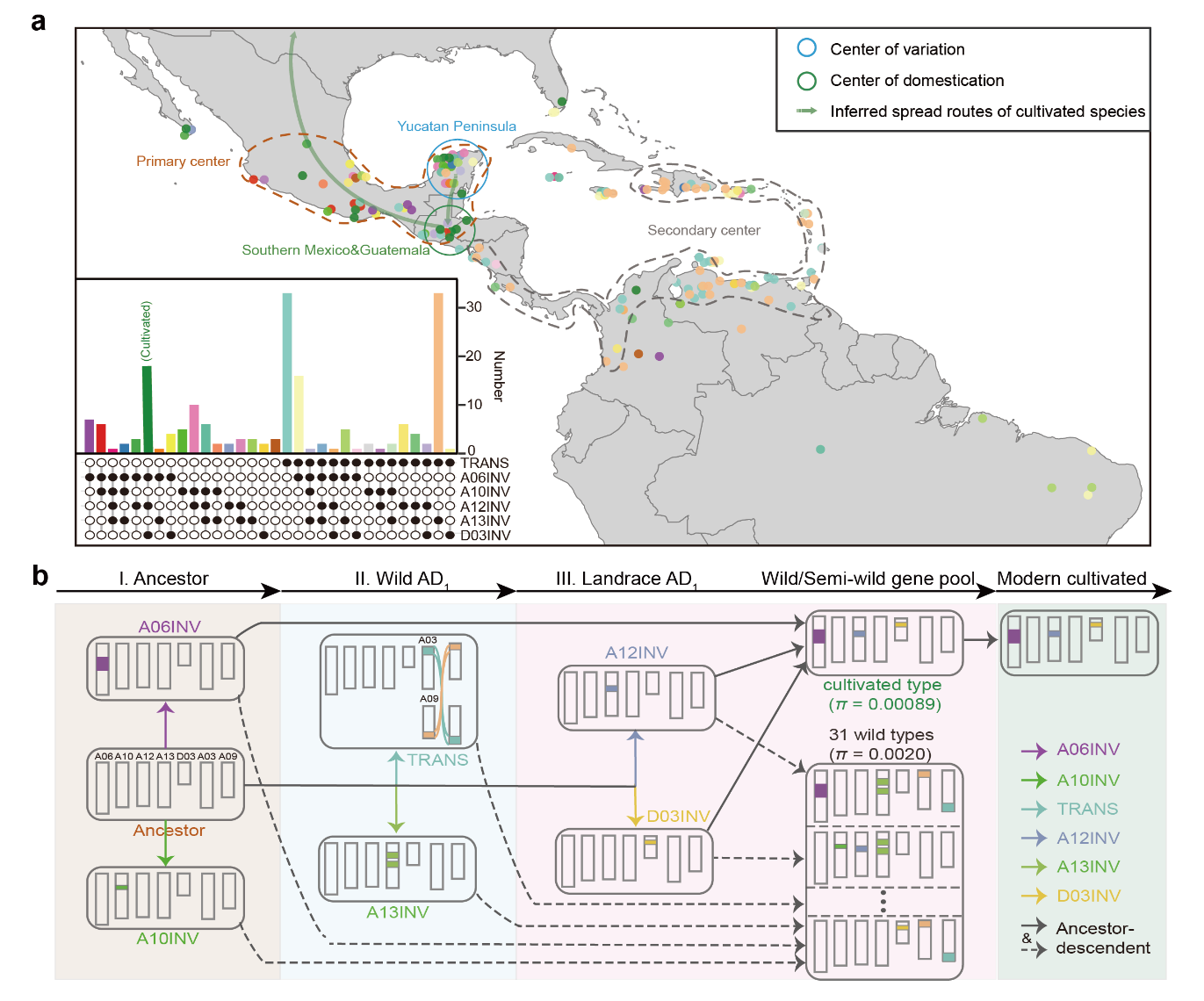 研究团队选取107份陆地棉微核心种质,成功构建陆地棉超级泛基因组。首次发现陆地棉种内A03-A09染色体易位事件,证实该事件对种群分化及区域适应性具有显著影响。进一步研究揭示,在栽培陆地棉形成前,野生/半野生陆地棉经历了三阶段结构变异,基于这些变异可将陆地棉细分为32种单倍型,而现代栽培种仅源于其中一种单倍型,明确了其遗传基础狭窄的核心原因。研究从基因组层面有力证实中美洲-加勒比海岸双多样性中心假说,重构了陆地棉“尤卡坦半岛起源→危地马拉扩散→全球传播”的三阶段驯化传播路径。