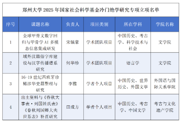近日,全国哲学社会科学工作办公室公布2025年国家社科基金冷门绝学研究专项立项名单。郑州大学宋镇豪教授的“全球甲骨数字回归与甲骨学AI多模态信息集成研发”学术团队项目、何华珍教授的“域外汉籍俗字库建设与汉字传播谱系研究”学术团队项目、李雅教授的“16-19世纪西班牙珍稀涉华史籍整理与研究”学者个人项目、田成方教授的“出土资料与《春秋大事表·列国姓氏表》《春秋列国卿大夫世系表》补苴研究”学者个人项目等获批立项,立项数位居全国高校前列。