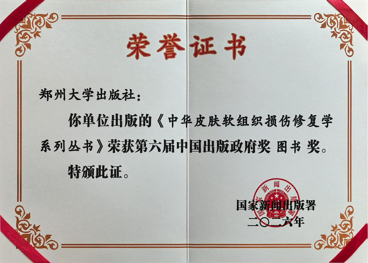 中国出版政府奖是我国新闻出版领域的最高奖项,每三年评选一次,旨在表彰和奖励国内新闻出版业优秀出版物、出版单位和个人,代表行业权威认可与最高水准。本届中国出版政府奖图书奖共评出60项,其中高校出版社获奖7项。我校获奖的《中华皮肤软组织损伤修复学系列丛书》是“十四五”国家重点图书出版规划项目和2022年度国家出版基金资助项目图书。孙保营、杨雪冰担任项目负责人,李振川、薛晗、张锦森等担任责任编辑,中国工程院院士、美国国家工程院外籍院士付小兵教授领衔总主编。这是郑州大学出版社继2021年荣获第五届中国出版政府奖后,时隔四年再次荣获这一国家级出版最高荣誉,也是连续获得第五届、第六届中国出版政府奖图书奖的3家高校出版社之一,充分彰显了学校出版社在学术出版领域的持续深耕与精品战略成效。