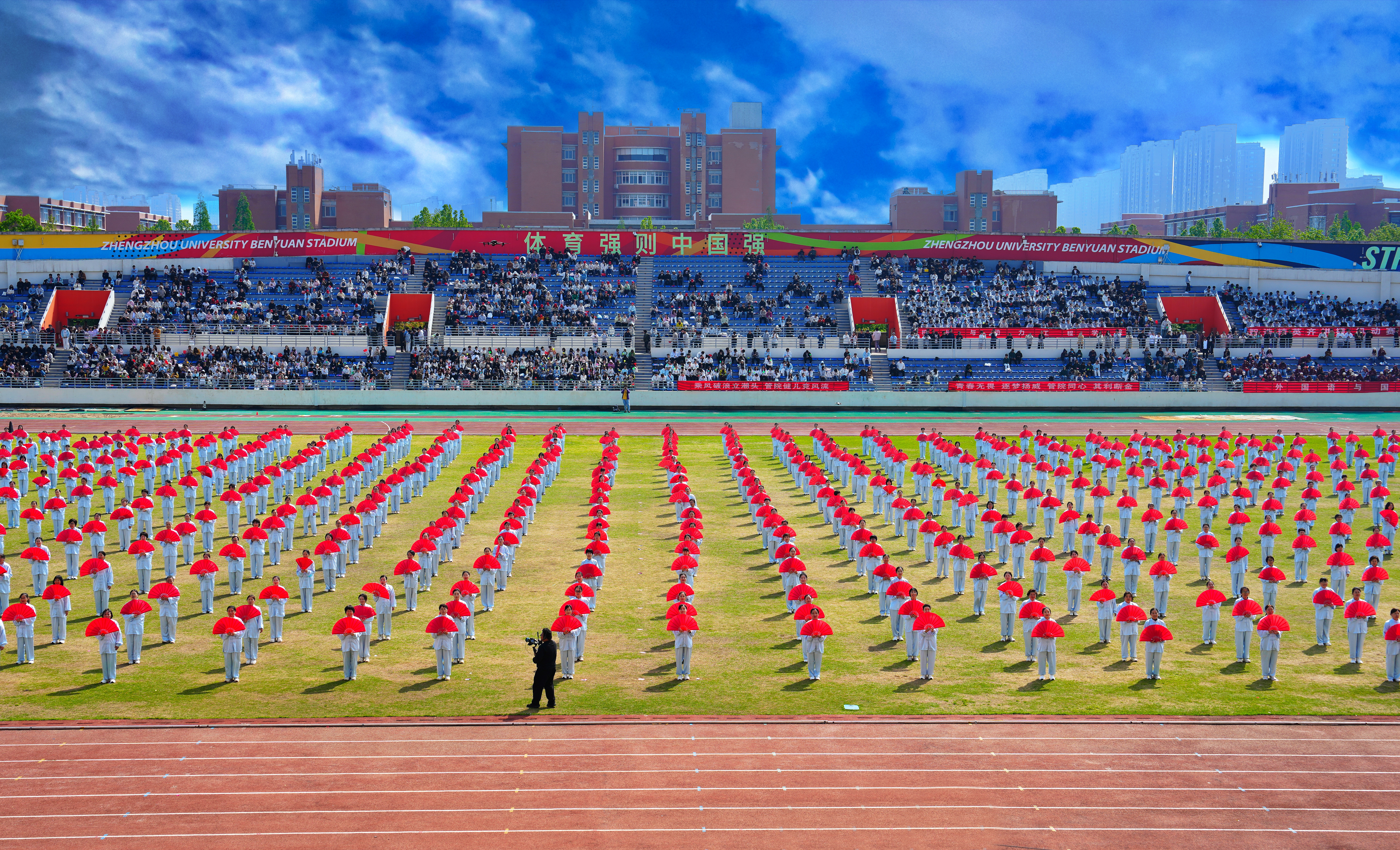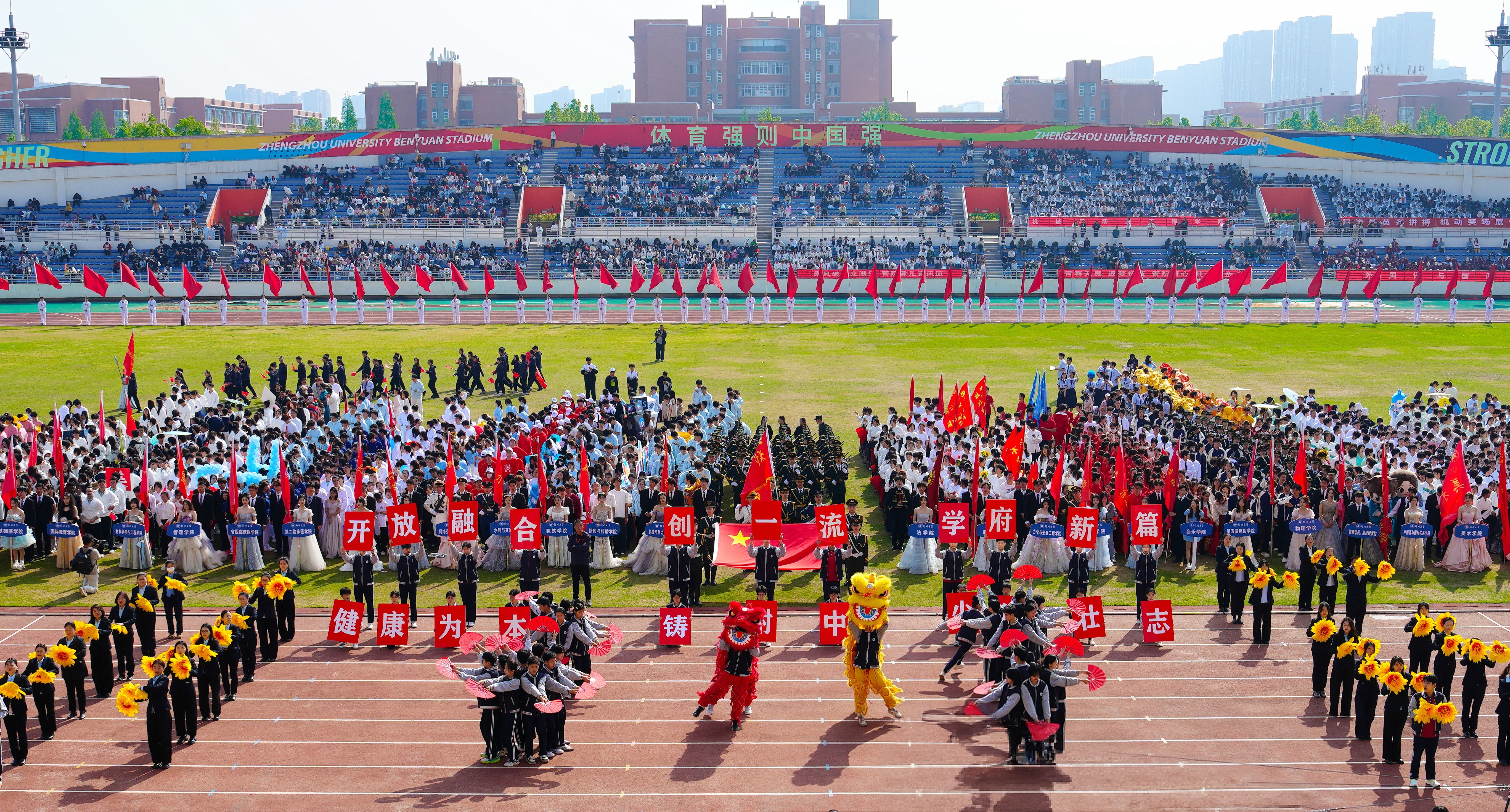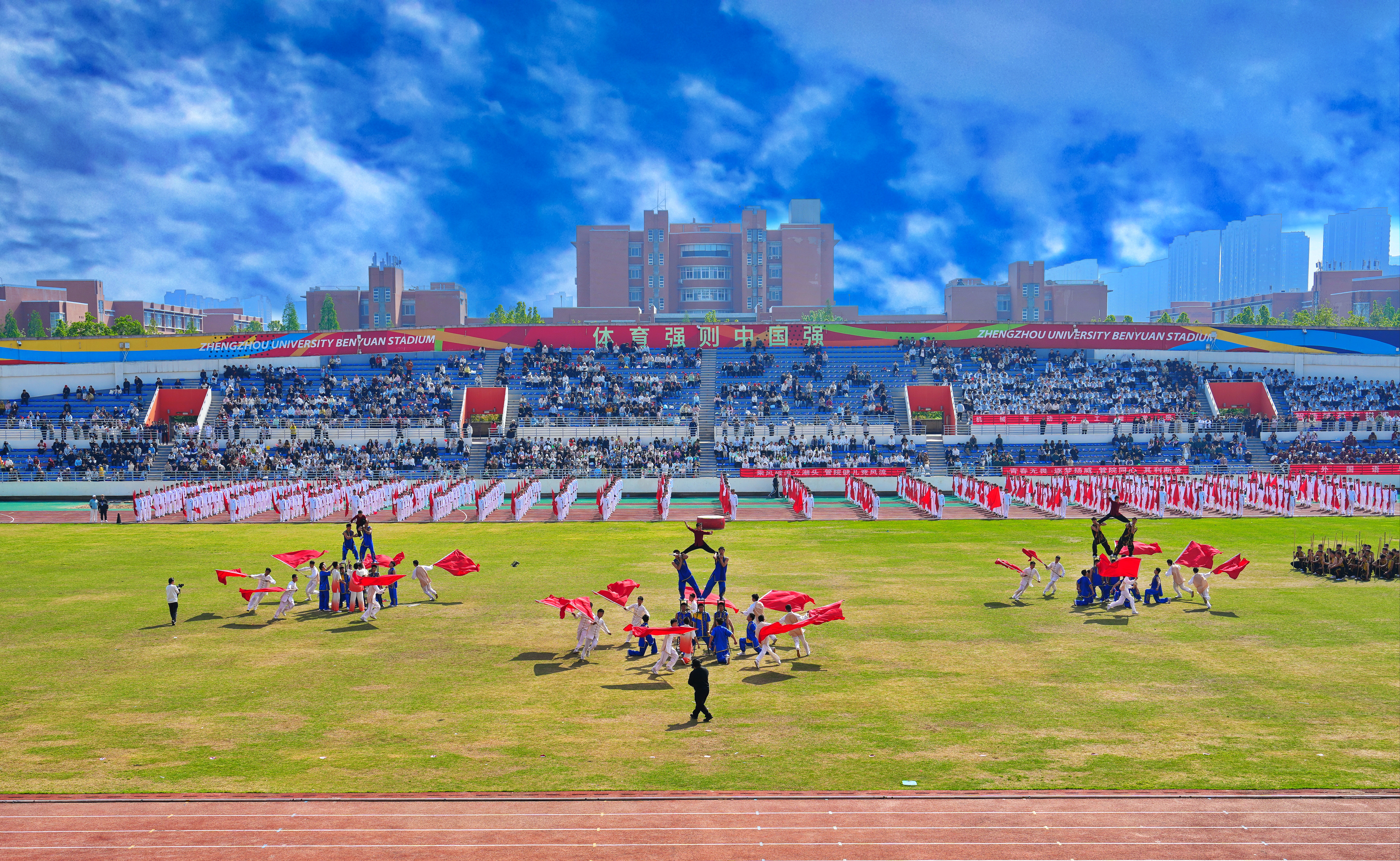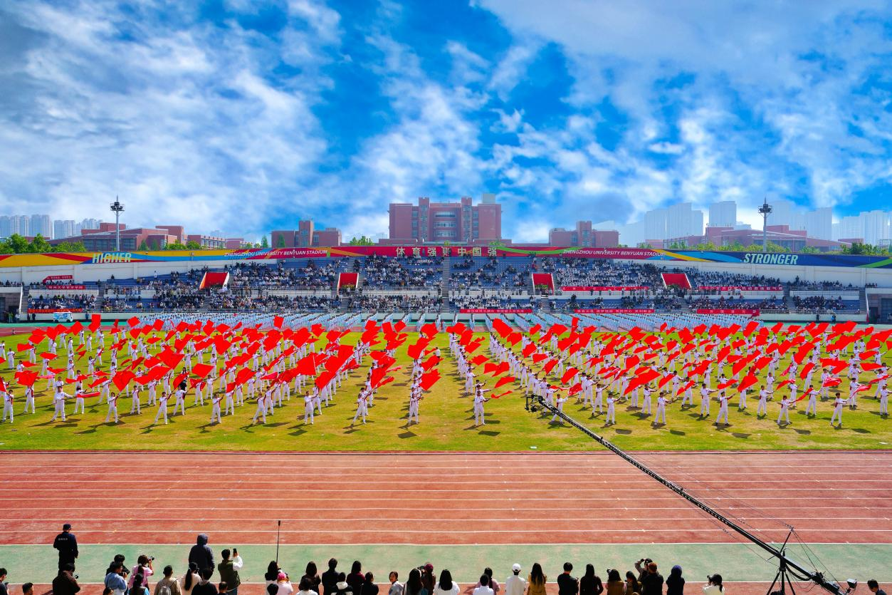 大型开幕式展演精彩纷呈。第一篇章《少林武魂·中华脊梁》中,少林塔沟武校170名少年以刚劲雄浑的中华武术展现武学风骨,挺起民族脊梁,一招一式打出浩然正气,彰显中华少年的责任担当。第二篇章《旗舞军魂·强国有我》中,运动与体育学院400余名学子挥舞鲜红旗帜,舞出青春军魂,纪念红军长征胜利90周年,立下“强国有我”的青春誓言,向革命先辈深情致敬。第三篇章《扇韵太极·巾帼风华》将太极与扇舞相结合,全校50多个基层工会的750名女教职工以太极扇演绎东方雅韵,绽放师者风华,展现新时代女教职工的昂扬风貌。
