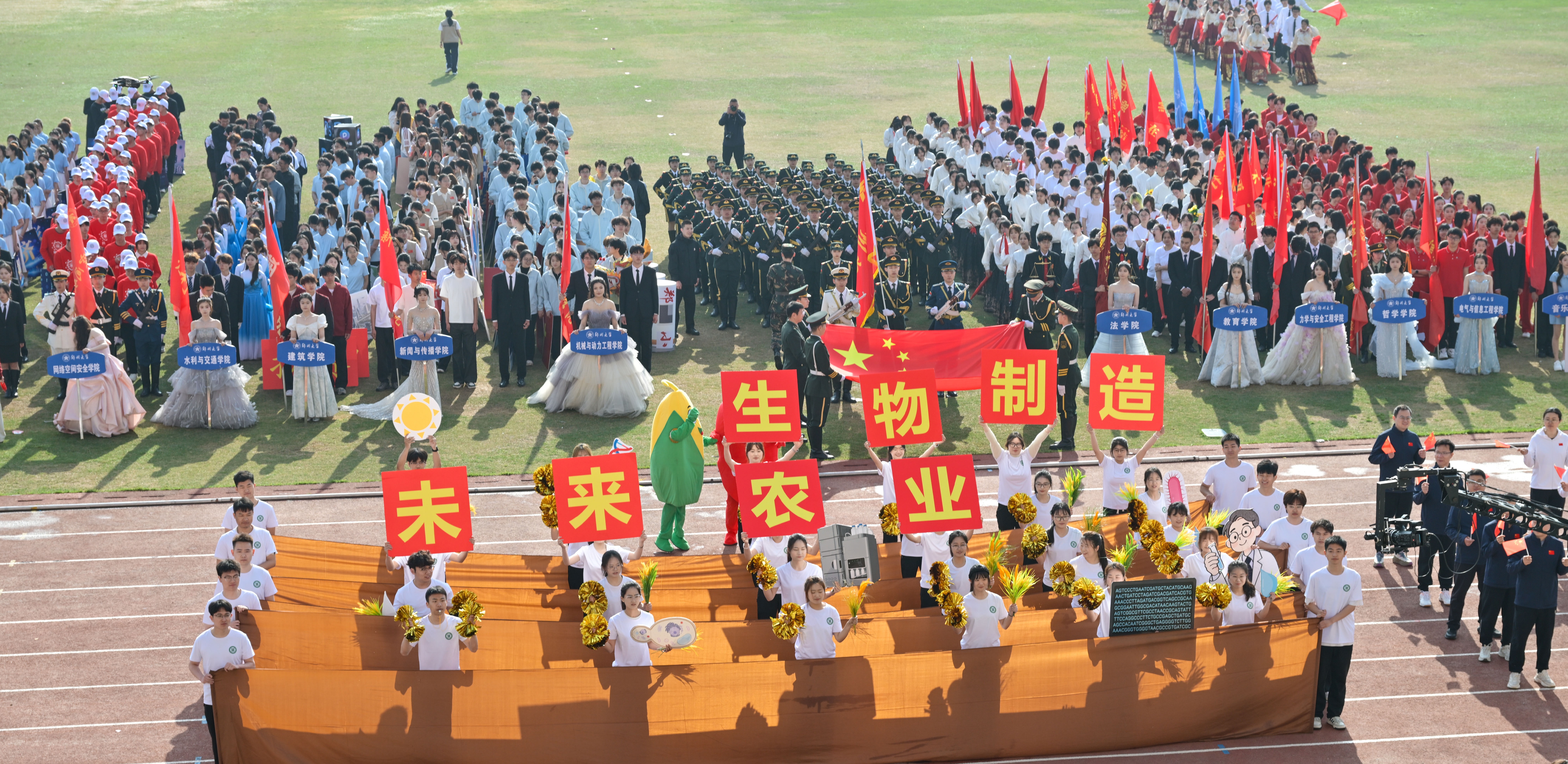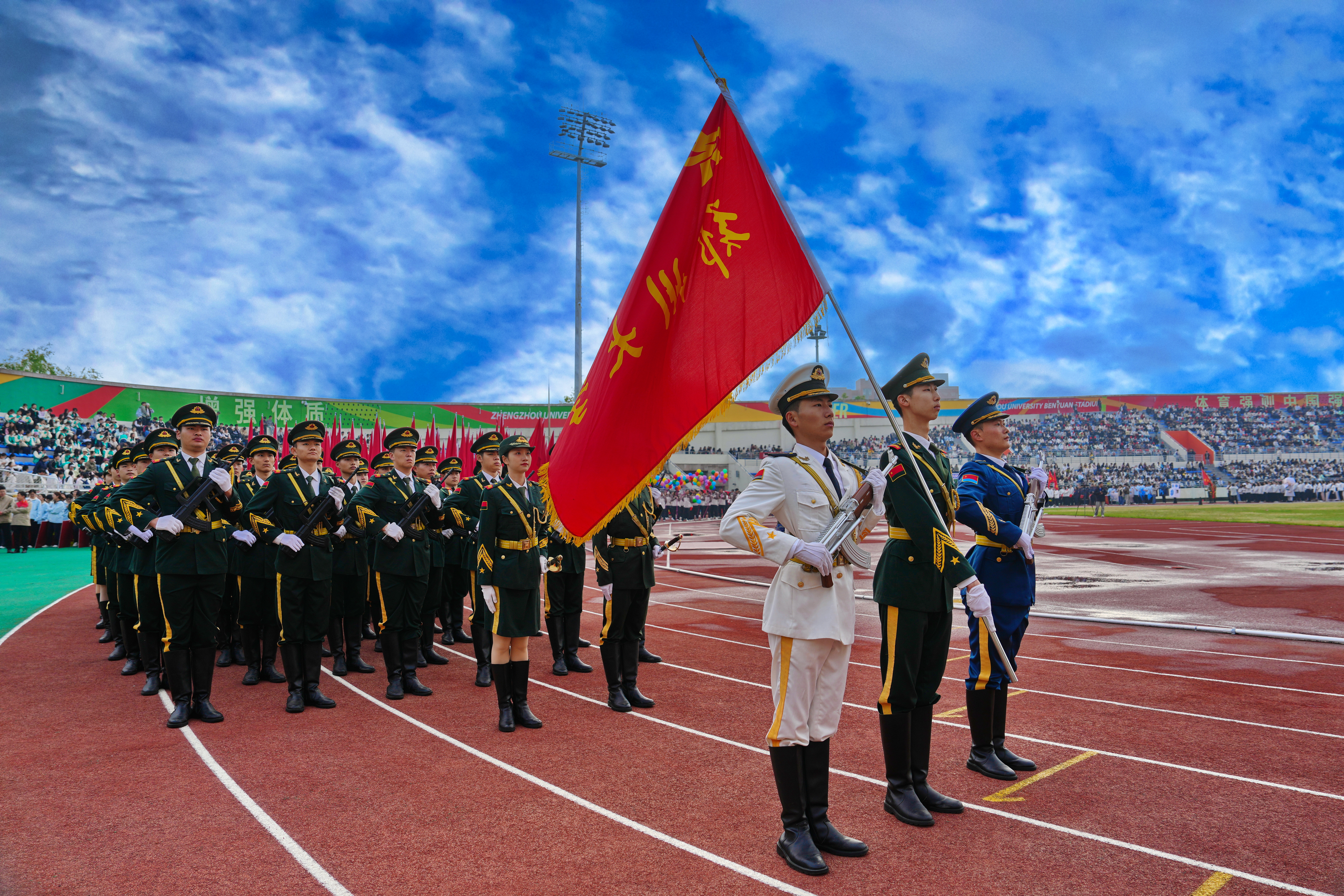 上午8时,伴随着激昂的《运动员进行曲》,运动会入场式正式开始。国旗护卫队步伐铿锵,护送五星红旗庄严入场。紧随其后的仪仗队精神抖擞,展现出郑大学子昂扬向上的精神风貌。48个学院及直附属单位的运动员方队依次步入会场,在主席台接受检阅。银龄教职工方队首次登场,用从容坚定的身姿彰显了薪火相传的使命担当。各方队创意十足,整齐划一的方阵变换间,尽显学科底色、专业底蕴与青春创意,充分展现新时代郑大师生昂扬向上、博学笃行的精神风貌。