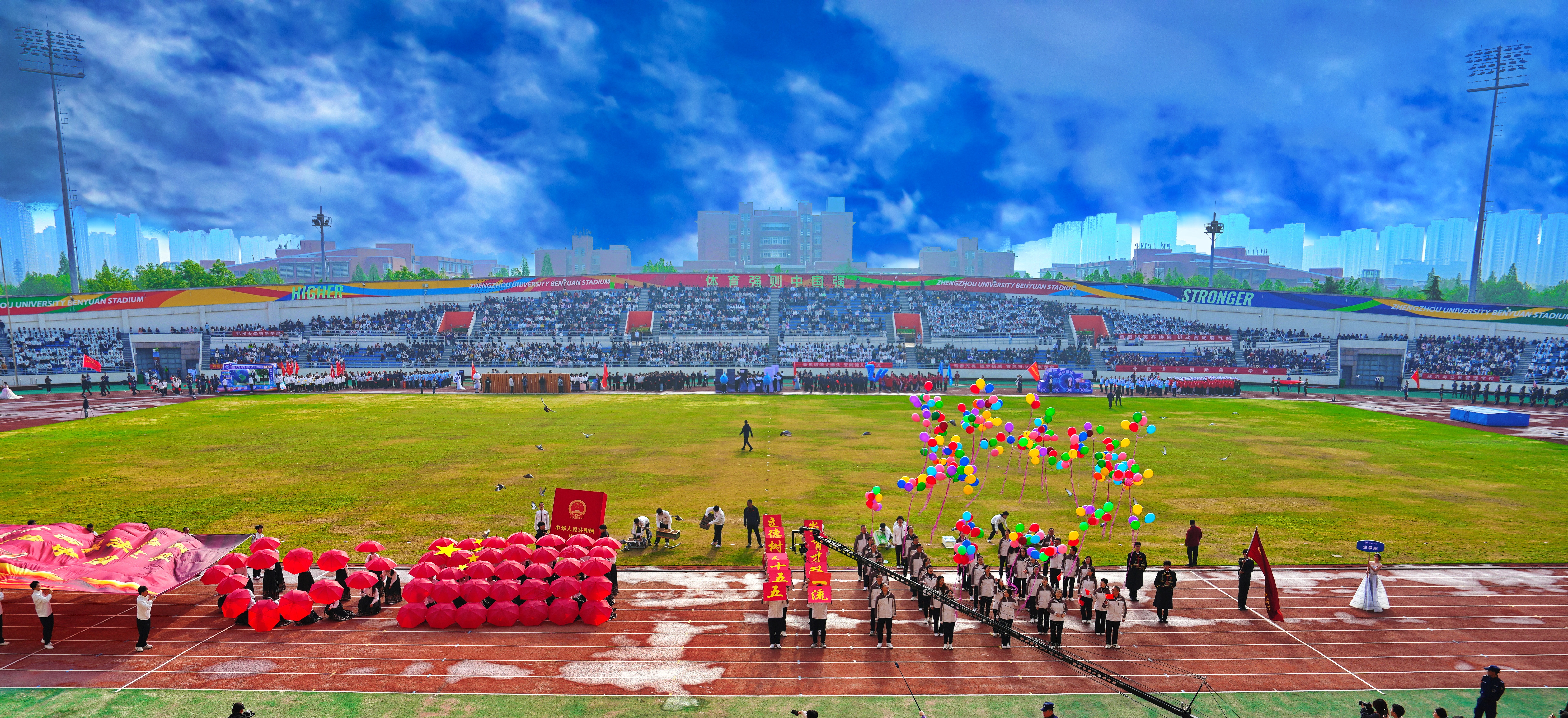 春启新程,体铸风华。4月9日上午,郑州大学2026年阳光体育运动会在主校区本源体育场开幕。河南省体育局党组成员、副局长李激扬,河南省教育厅体卫艺处处长舒卫方,郑州市高新区党工委副书记张超,校领导李成伟、李蓬、胡少伟、王海杰、陈曦、臧双全,奥运冠军贾占波、孙甜甜等出席开幕式。省体育局、市高新区相关处室负责同志,校友代表、大会主席团全体成员、校部机关和各学院负责同志在主席台就座,近3万名师生参加。开幕式由校党委副书记王利国主持。