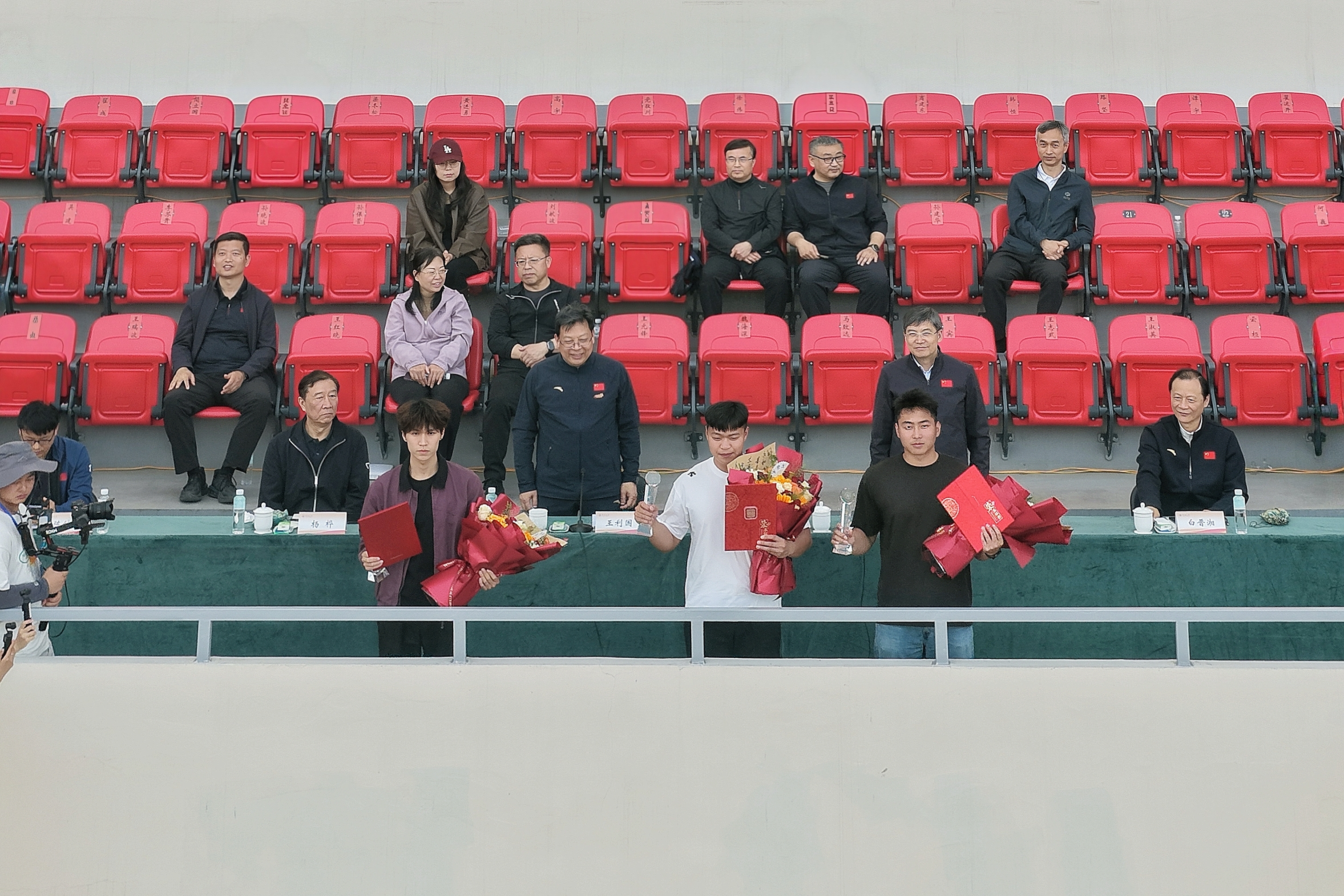 在雄壮的国歌声中,大会闭幕式正式开始。赛事主管宣读竞赛成绩,王利国宣读打破校运会纪录奖运动员名单,王海杰宣读体育道德风尚奖获奖单位名单,陈继超宣读优秀仪仗队获奖单位名单,孙保营宣读优秀宣传奖获奖单位名单。与会领导为获奖单位颁发奖杯。