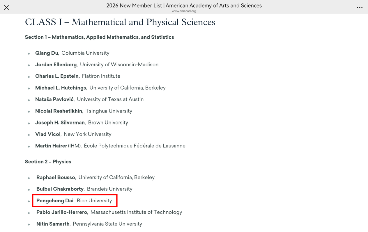 近日,美国艺术与科学院(The American Academy of Arts and Sciences,简称AAAS)公布2026年度新增院士名单。郑州大学物理学院1980级校友、美国莱斯大学物理与天文系Sam and Helen Worden讲席教授戴鹏程,凭借在实验凝聚态物理领域的杰出贡献,成功当选数学与物理科学类别院士。这一荣誉是国际学术界对其卓越学术成就的高度认可,也是我校人才培养与学科建设取得的又一标志性成果。