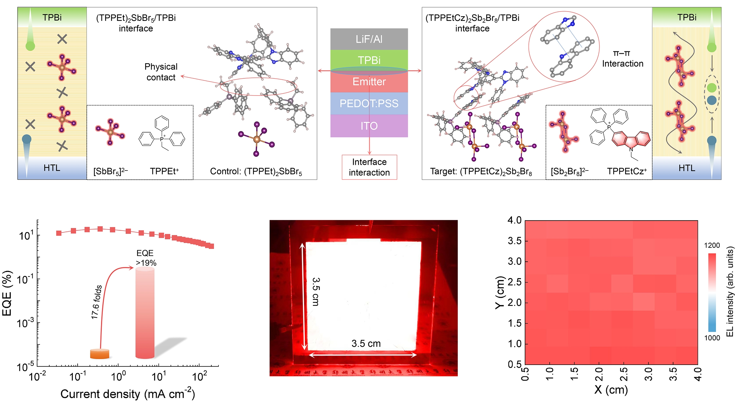 针对上述问题,科研团队从分子层面出发,提出一种全新的有机阳离子设计策略,构建了咔唑功能化的有机阳离子。该阳离子一方面能够与无机卤化物框架和溶剂分子形成强氢键相互作用,有效调控薄膜结晶动力学,从而获得致密、均匀、低缺陷密度的高质量发光层;另一方面,其咔唑单元可与电子传输层中的苯并咪唑结构产生显著的π-π堆积作用,改善界面能级匹配和分子耦合,促进电子在界面处的高效传输与注入。在材料发光性能提升与界面工程优化的协同作用下,研究团队成功制备出高性能锑卤化物LED器件,最大外量子效率达到19.4%,工作半衰期达到10190分钟,较以往报道水平实现了跨越式提升。这一成果不仅大幅缩小了光致发光效率与电致发光效率之间的差距,也为有机无机杂化金属卤化物在高效、稳定LED中的应用奠定了重要基础。