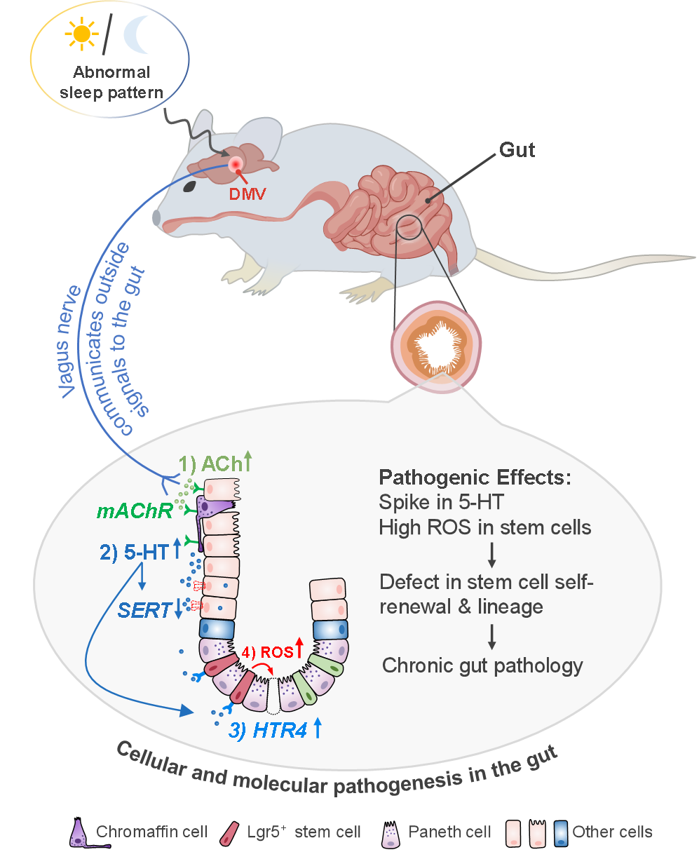 研究发现,位于延髓的DMV是大脑中对睡眠剥夺高度敏感的关键神经核团。睡眠不足可异常激活DMV神经元,增强迷走神经向肠道释放乙酰胆碱;乙酰胆碱进一步作用于肠上皮细胞的毒蕈碱型受体,促使肠嗜铬细胞大量释放五羟色胺(5-HT),并抑制其再摄取,导致肠道局部5-HT急剧升高;过量的5-HT激活肠道干细胞表面的HTR4受体,引发显著的氧化应激和整合应激反应,从而损害了肠道干细胞的自我更新和再生能力。动物实验显示,睡眠剥夺仅两天即可使小鼠肠道干细胞数量减少一半。