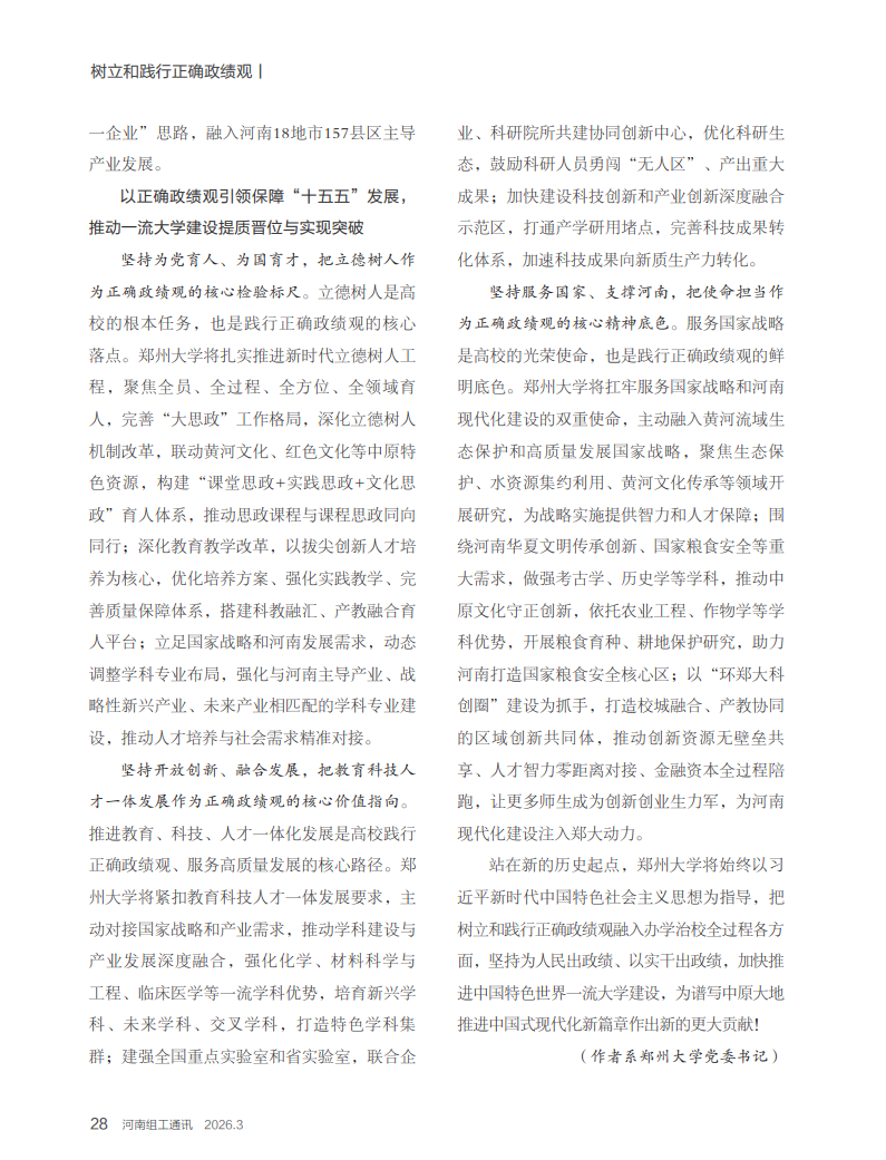 坚持为党育人、为国育才,把立德树人作为正确政绩观的核心检验标尺。立德树人是高校的根本任务,也是践行正确政绩观的核心落点。郑州大学将扎实推进新时代立德树人工程,聚焦全员、全过程、全方位、全领域育人,完善“大思政”工作格局,深化立德树人机制改革,联动黄河文化、红色文化等中原特色资源,构建“课堂思政+实践思政+文化思政”育人体系,推动思政课程与课程思政同向同行;深化教育教学改革,以拔尖创新人才培养为核心,优化培养方案、强化实践教学、完善质量保障体系,搭建科教融汇、产教融合育人平台;立足国家战略和河南发展需求,动态调整学科专业布局,强化与河南主导产业、战略性新兴产业、未来产业相匹配的学科专业建设,推动人才培养与社会需求精准对接。