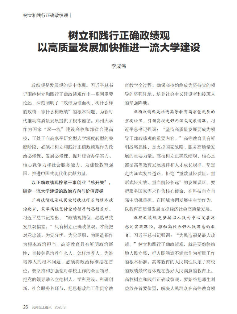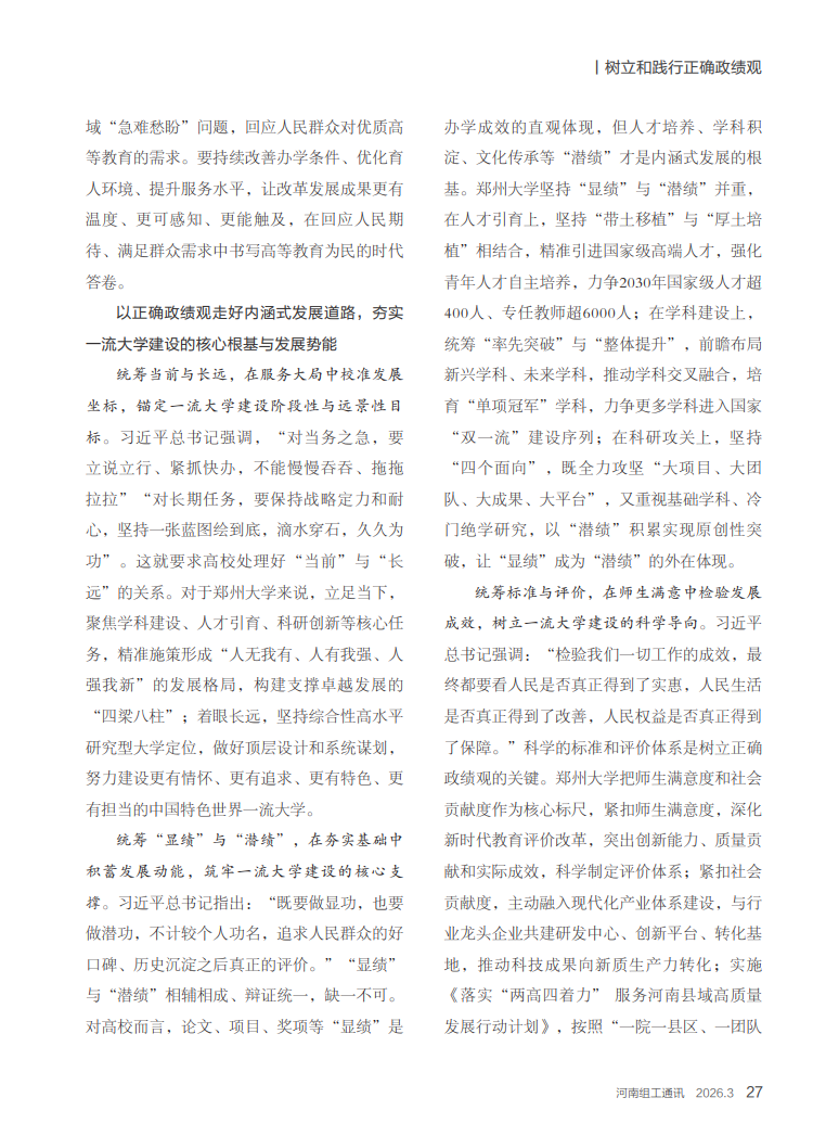 政绩观是发展观的集中体现。习近平总书记围绕树立和践行正确政绩观作出一系列重要论述,深刻阐明了“政绩为谁而树、树什么样的政绩、靠什么树政绩”的根本问题,为新时代推动高质量发展提供了根本遵循。郑州大学作为国家“双一流”建设高校和部省合建高校,正处于向高水平研究型大学深度转型的关键阶段,必须把树立和践行正确政绩观作为政治必修课、发展必修课,提升综合办学实力、核心竞争力和社会服务能力,为建设教育强国、推进中国式现代化贡献力量。